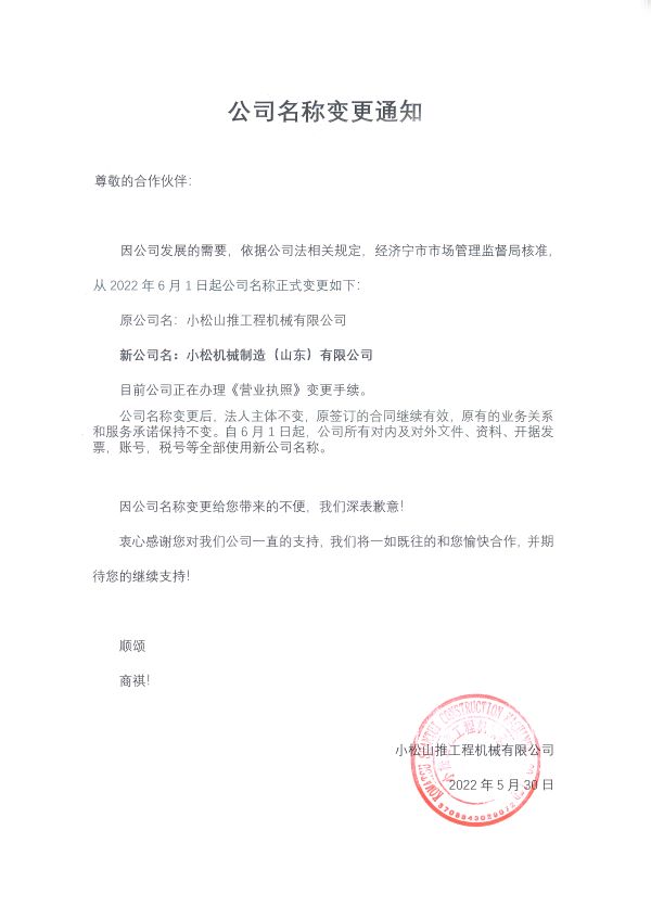 因公司發(fā)展需要,“小松山推工程機(jī)械有限公司”(以下簡稱:小松山推)于2022年6月1日正式更名為“小松機(jī)械制造(山東)有限公司”,詳情請參閱以下小松山推更名通知,特此公告。